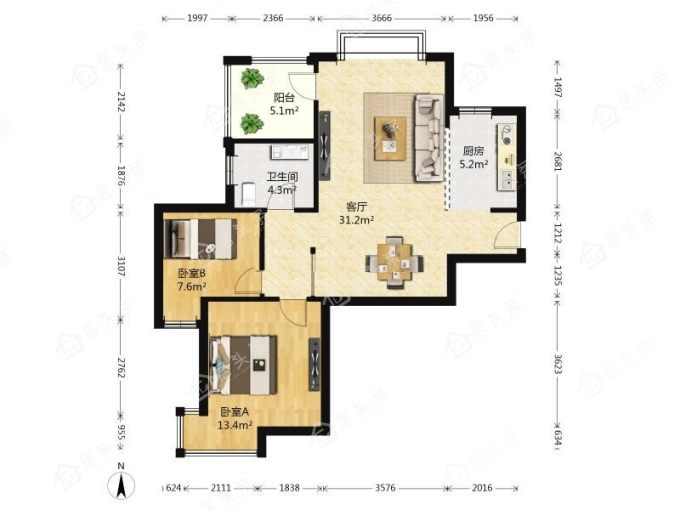 户型2室2厅1卫